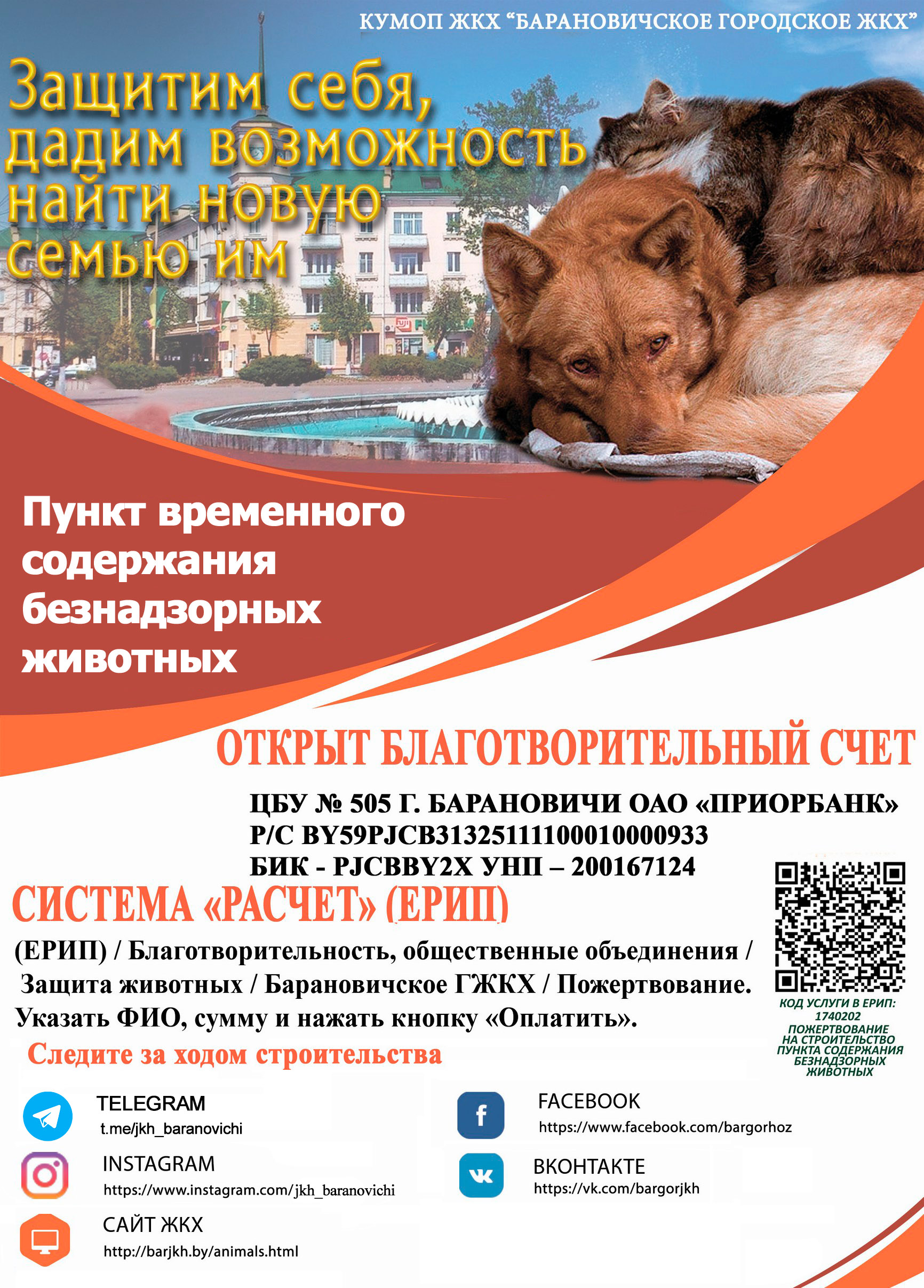 Для оказания финансовой помощи необходимо в ЕРИП пройти путь: Система «Расчет» (ЕРИП) / Благотворительность, общественные объединения / Защита животных / Барановичское ГЖКХ / Пожертвование / Указать ФИО пожертвователя денежных средств, сумму пожертвования и нажать кнопку «Оплатить».