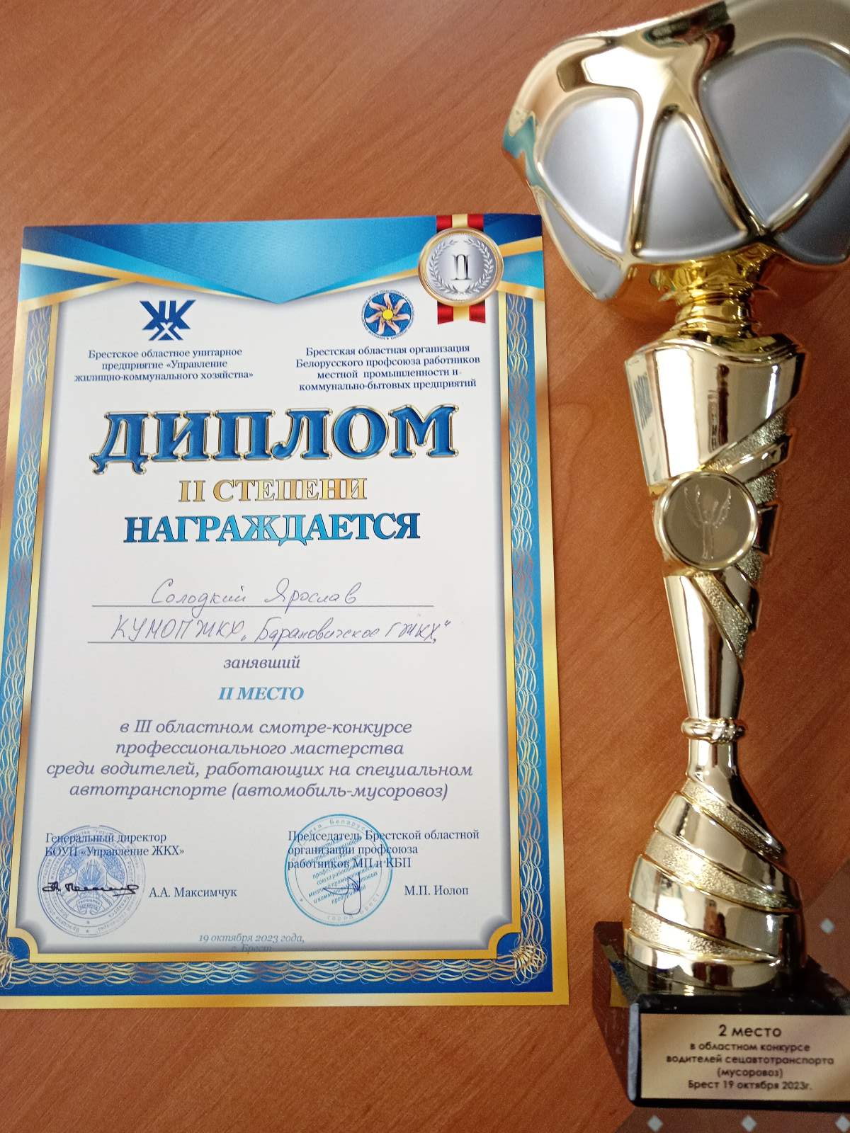 Поздравили Солодкого Ярослава Викторовича - водителя автомобиля занявшего второе место в областном конкурсе профессионального мастерства «Лучший водитель спецтранспорта – мусоровоза», экономиста Скороход Екатерину Владимировну, которая достойно на областном этапе конкурса защитила презентацию о совместной работе администрации, профсоюза и общественной организации направленной на патриотическое, духовное развитие молодого поколения, Попченю Елену Сергеевну - мастера службы санитарной очистки и уборки, достойно представившей наше предприятие на республиканском конкурсе молодых работников «SuperПРОФИ-2023».